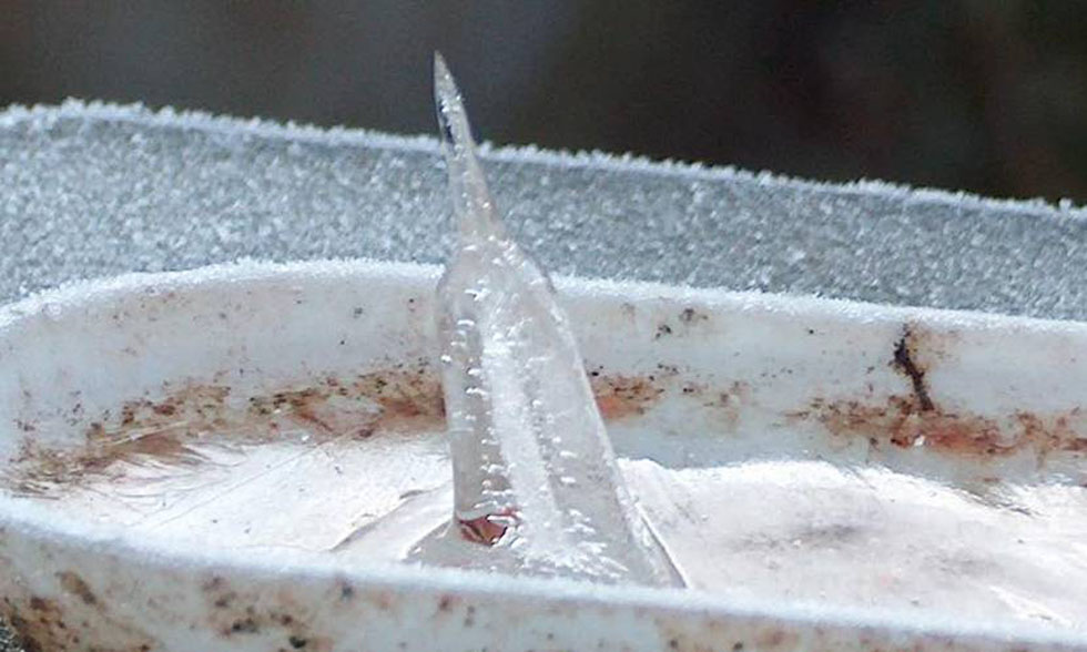 I got up one cold frosty morning in December 08 and saw this out of the kitchen window rising out of the water tray on the bird table? Strange, huh?